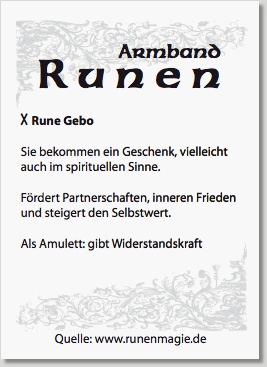 Geliefert werden die Armbänder mit einem Kärtchen (Abb.), damit der Beschenkte weiss, was die Runen und die Runenkombination bedeuten.